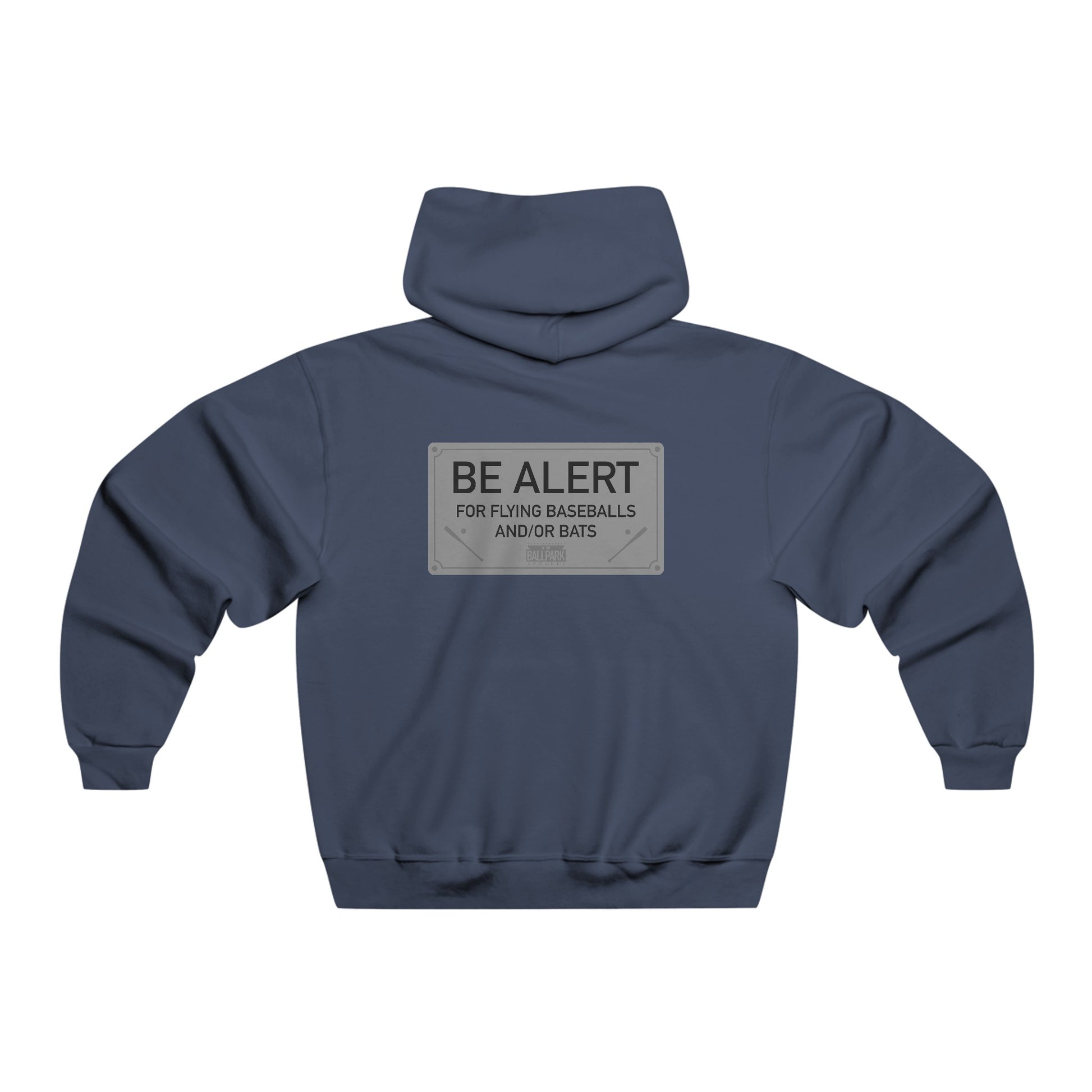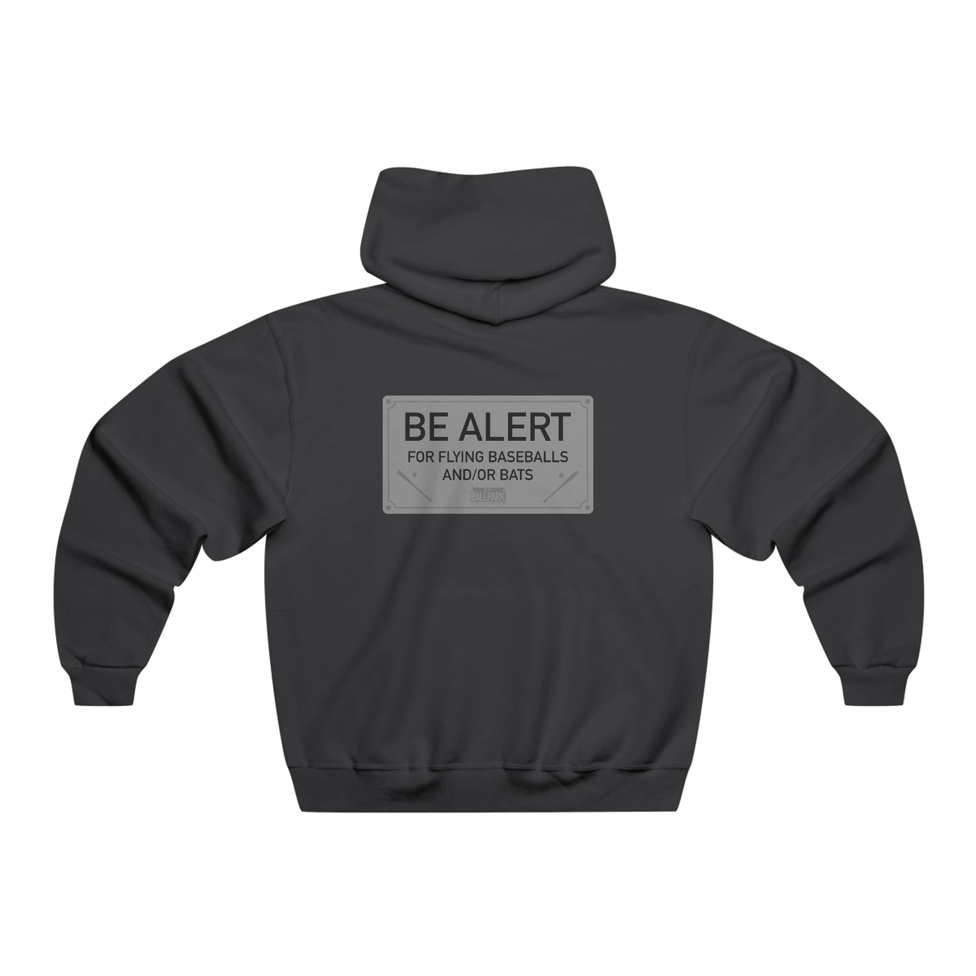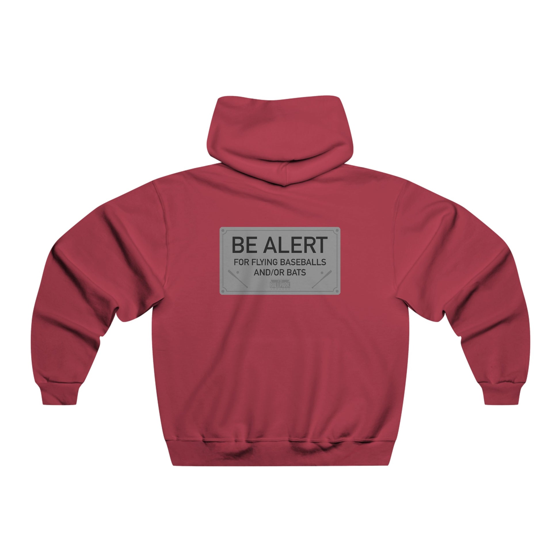 This hoodie is designed to replicate a seat you'd find at the ballpark! The front features a baseball shaped seat number, while the back features the "Be Alert" sign that you might find on the back of ballpark seats.