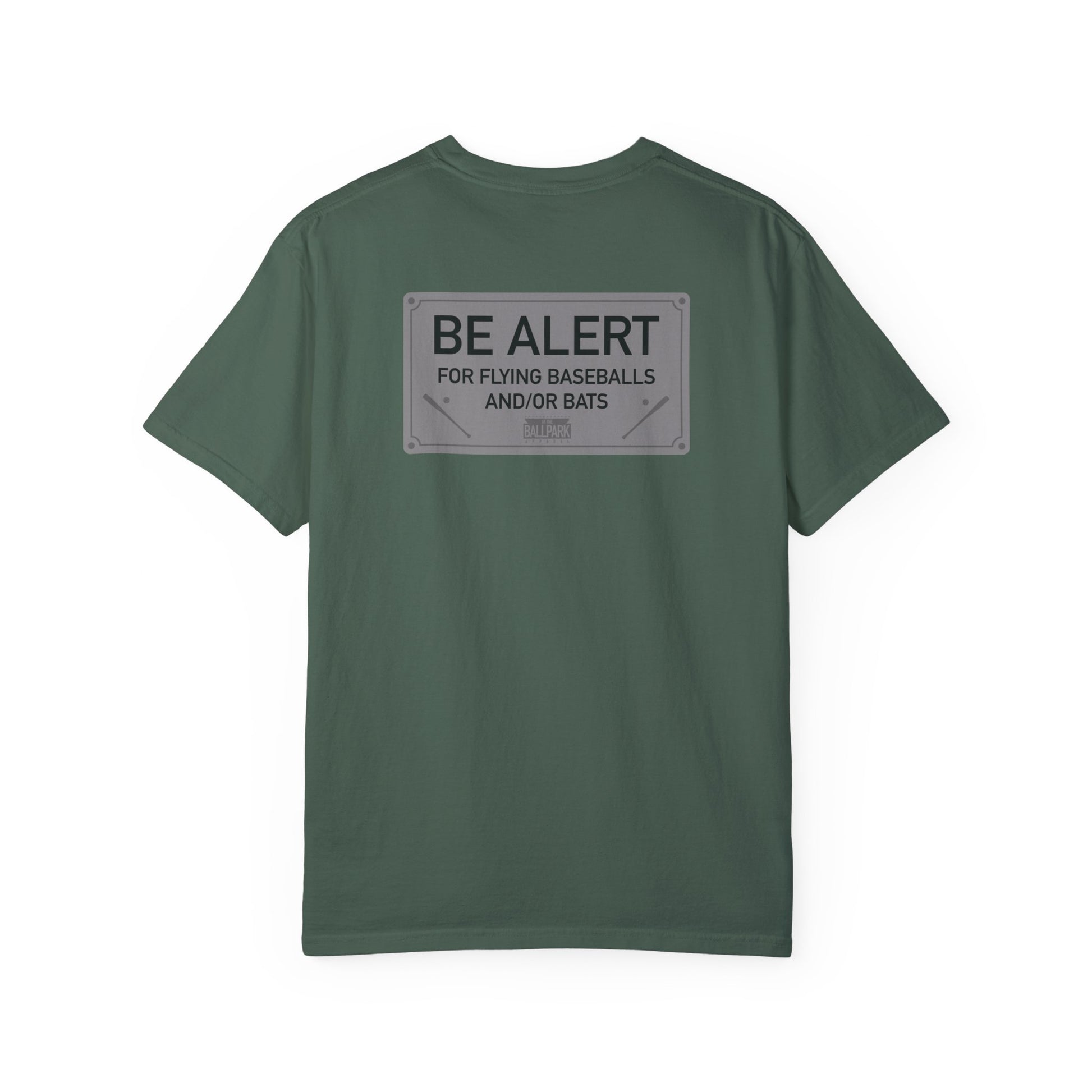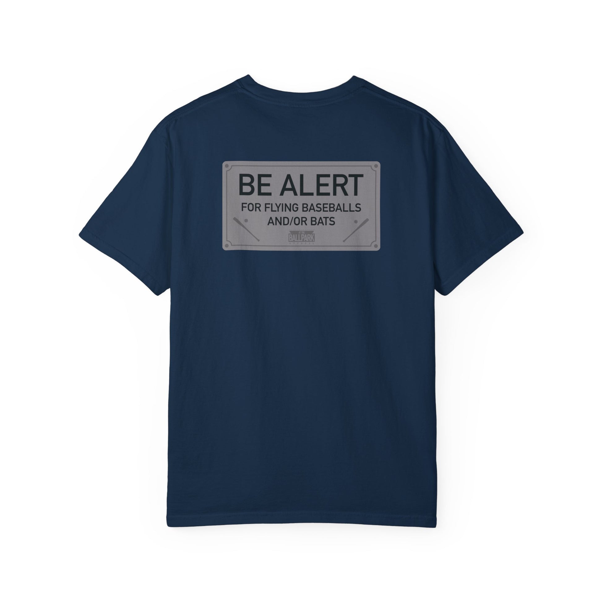 This shirt is designed to replicate a seat you'd find at the ballpark! The front features a baseball shaped seat number, while the back features a "Be Alert" sign that you might find on the back of ballpark seats.