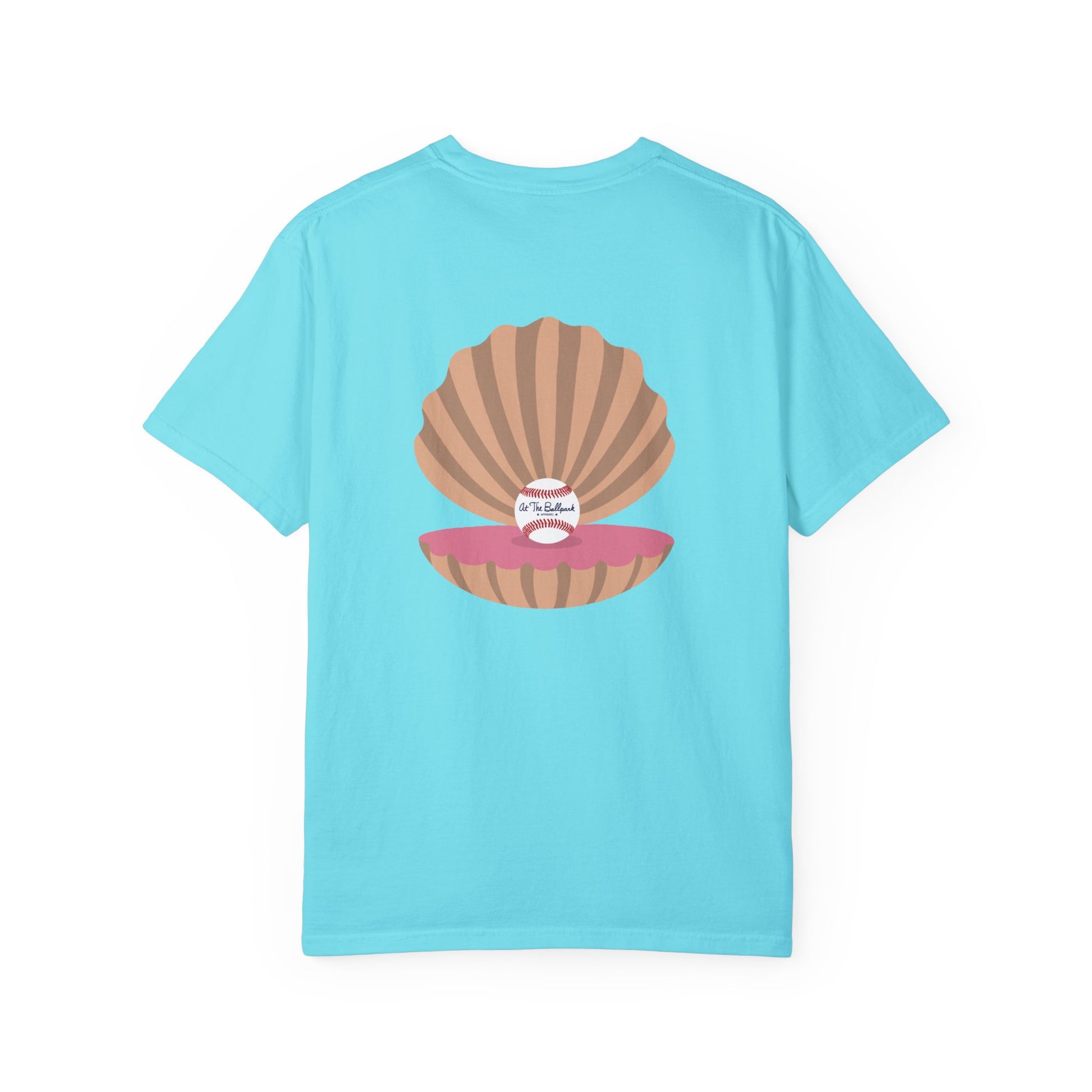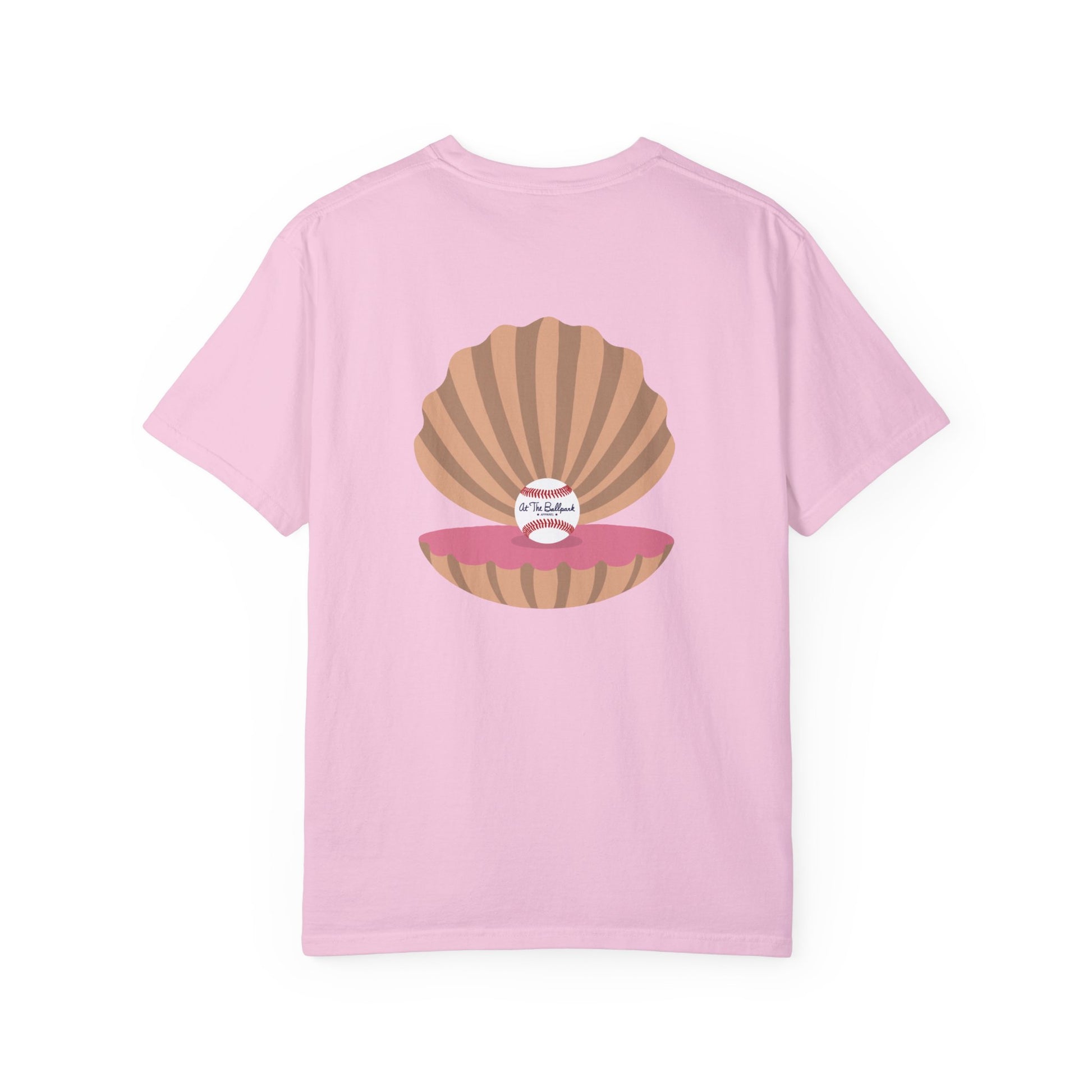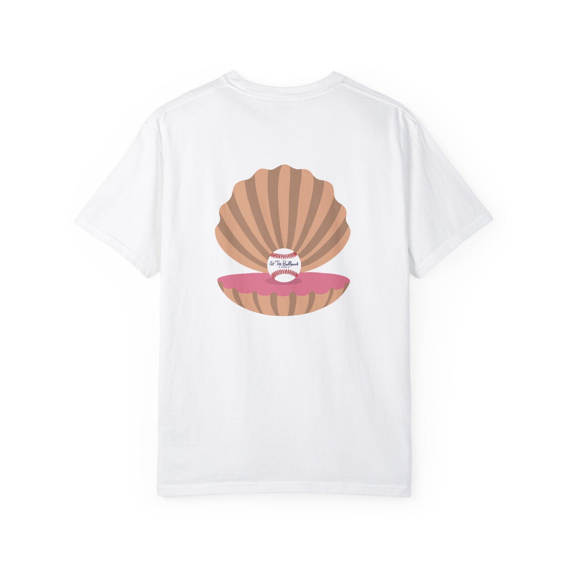 Everybody loves a good pearl! This shirt features a beach themed "At The Ballpark Apparel" logo on the front, and a pearl of a baseball inside an oyster on the back.