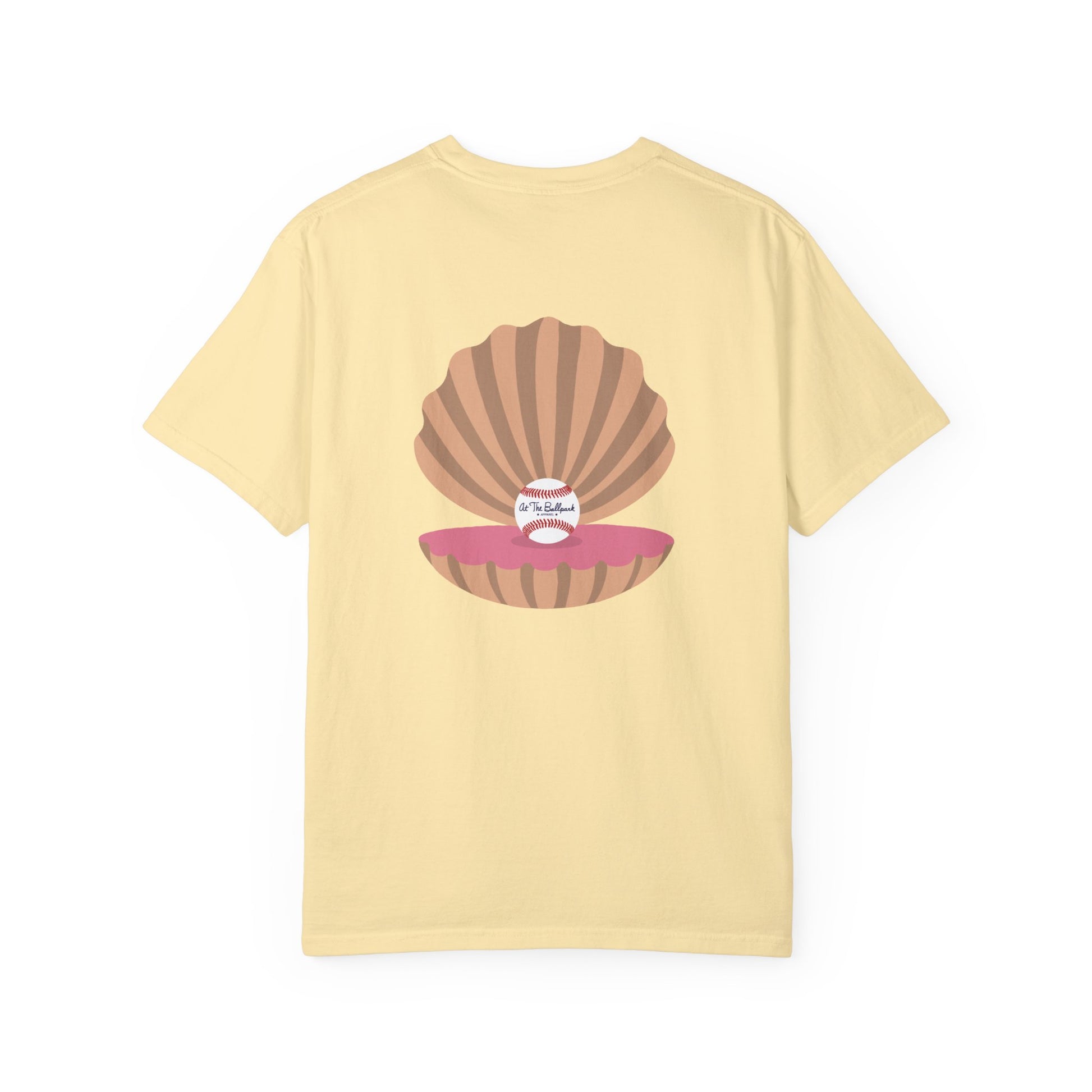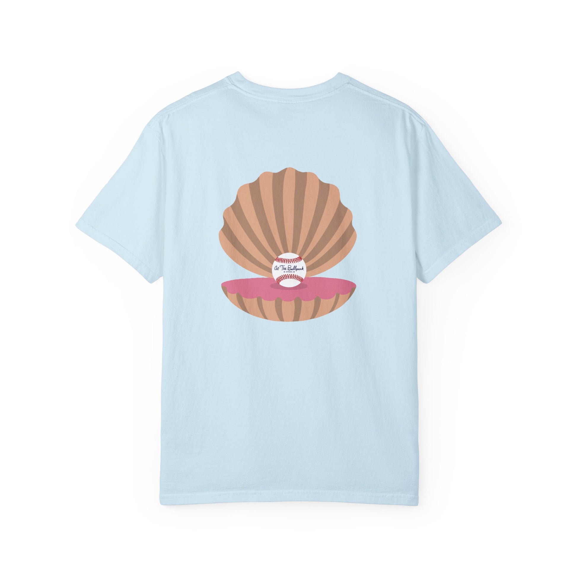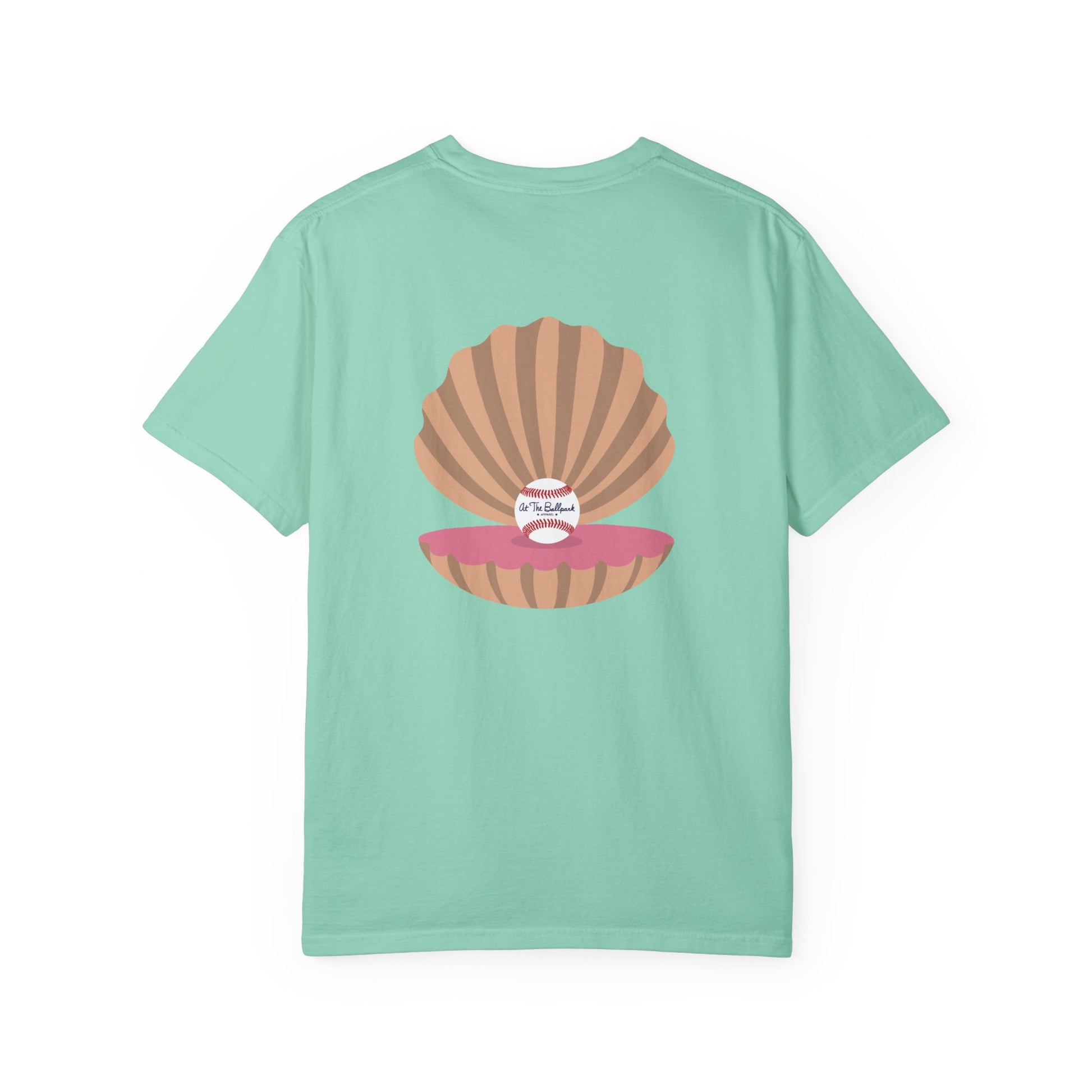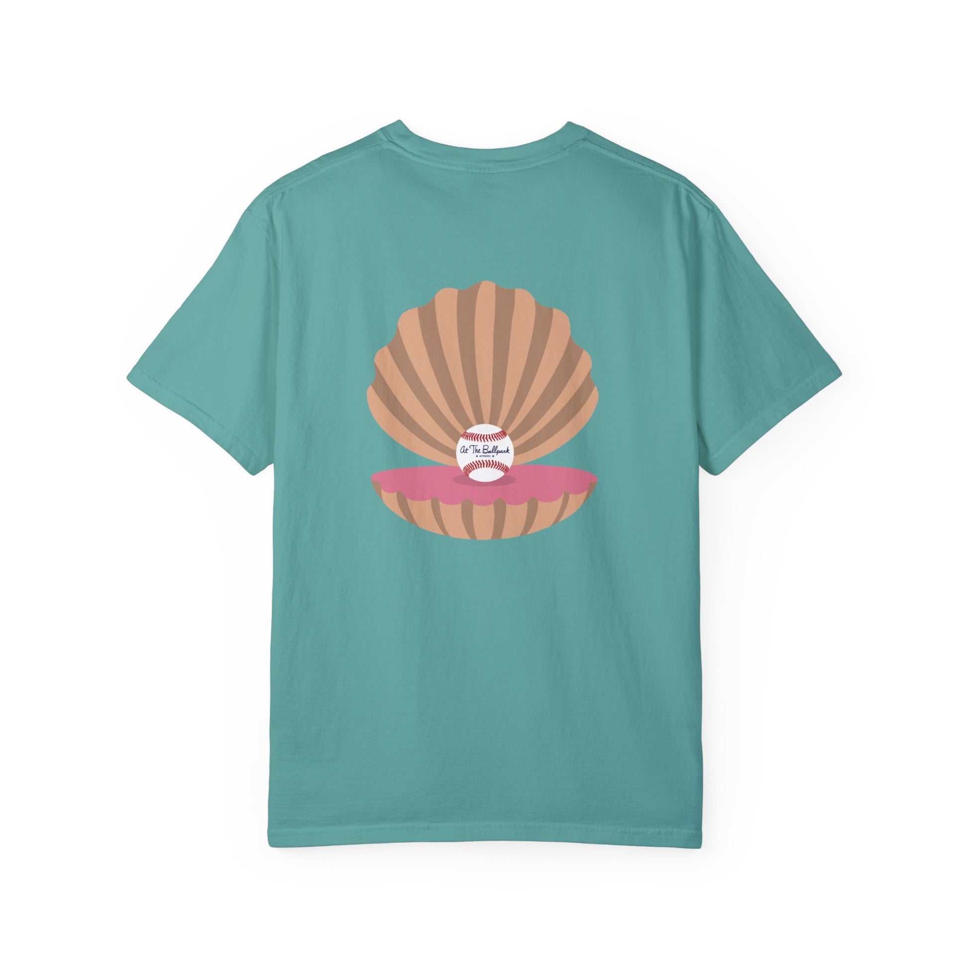 Everybody loves a good pearl! This shirt features a beach themed "At The Ballpark Apparel" logo on the front, and a pearl of a baseball inside an oyster on the back.
